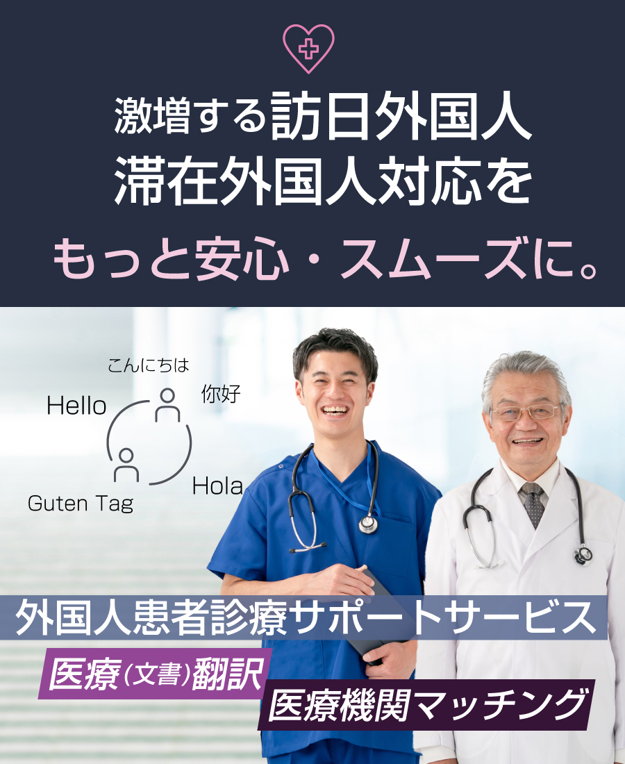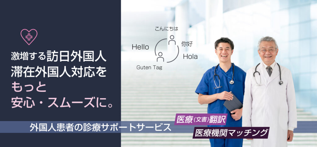 激増する訪日外国人、滞在外国人への対面・オンライン・電話での医療通訳、診断書や検査結果に対応する医療文書翻訳、症状や言語に応じた医療機関マッチング、そして国際的な電子カルテとつながるEMR連携を通して、Medic Translateは外国人患者と医療機関をスムーズにつなぎ、医療現場を支え、抜苦与楽の医療を実現します。