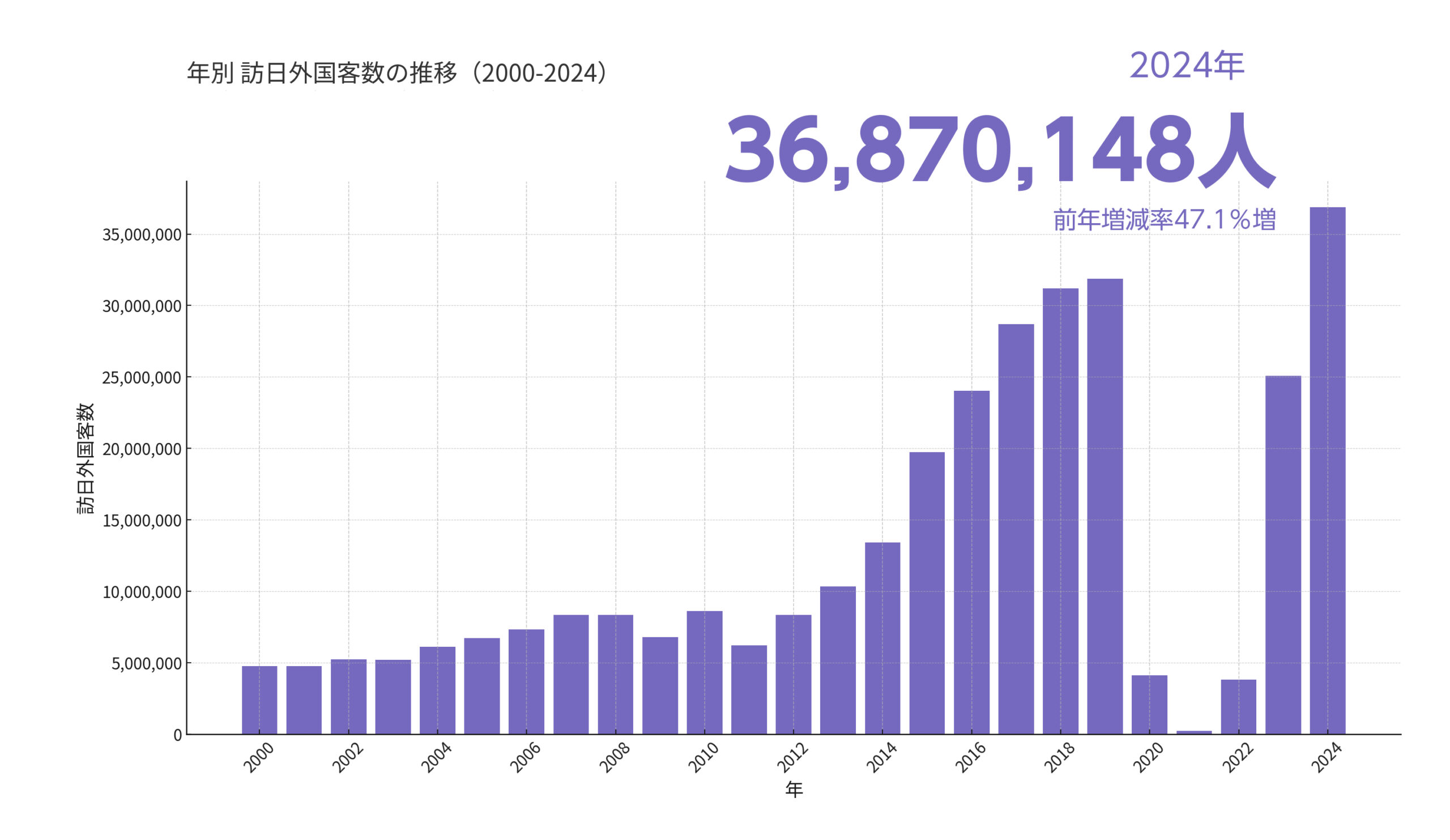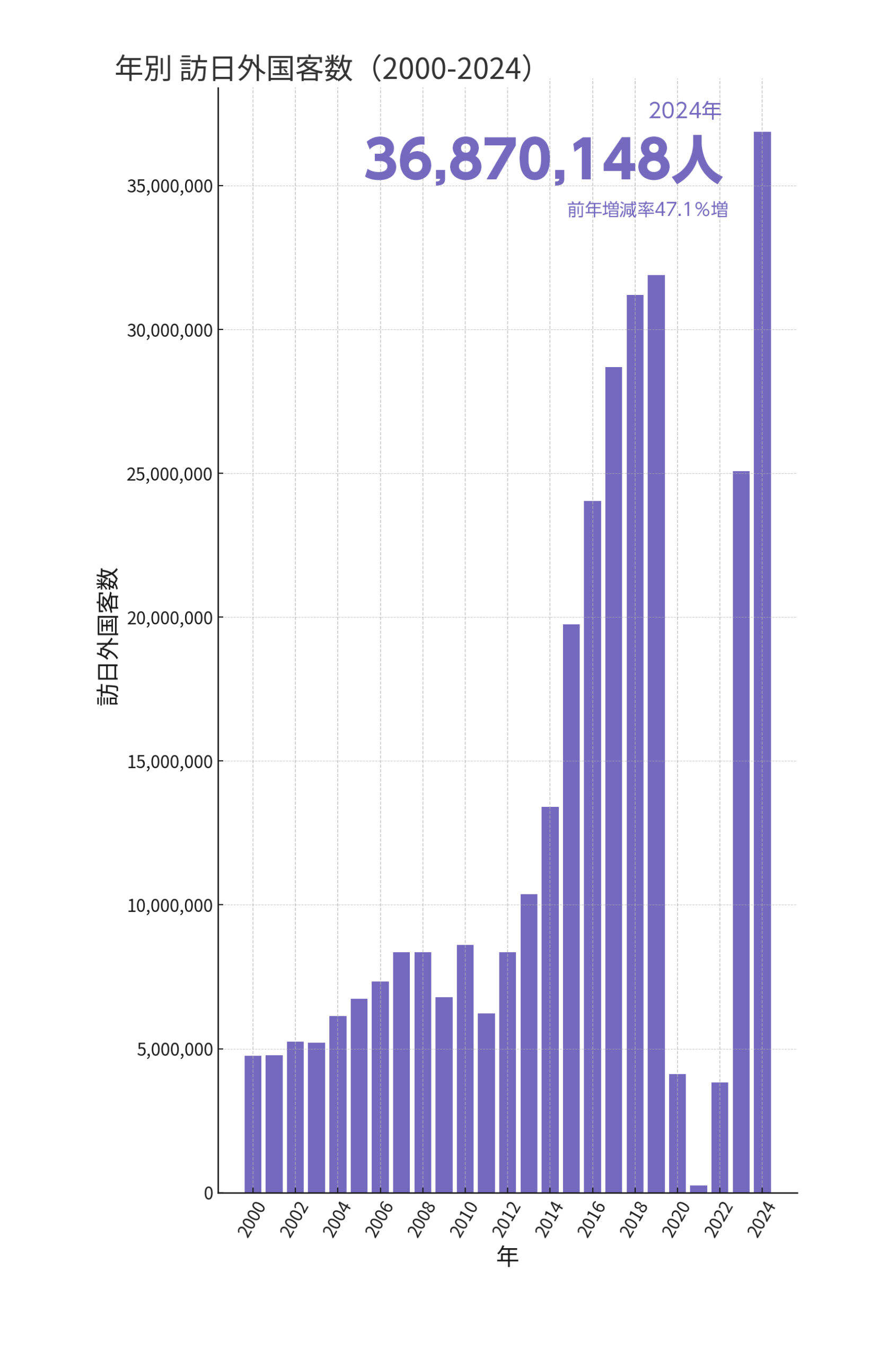 2024年日本の訪日外国人旅行者数は 約3,687万人。コロナ以前の2019年(約3,190万人)を上回る水準に回復・成長しています。(出典:日本政府観光局)